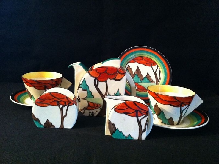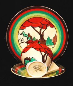 The modern Jazz Age and the Art Deco style influenced her designs, but her Bizarre patterns and shapes were all from her own creativity. She called it Bizarre as she said, “because it is intended to surprise people.” In 1930 she stated, “Women today want continual change, they will have a color and plenty of it. Color seems to radiate happiness and the spirit of modern life and movement, and I cannot put too much of it into my designs to please women.”