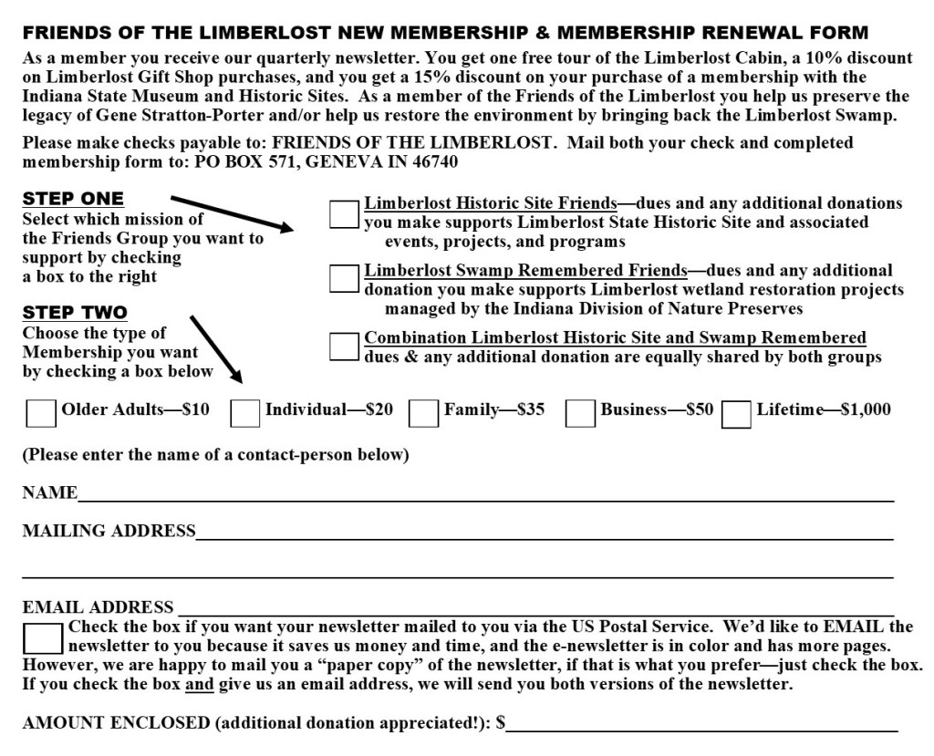 Please make checks payable to: FRIENDS OF THE LIMBERLOST. Mail both your check and completed membership form to: PO BOX 571, Geneva, IN 46740