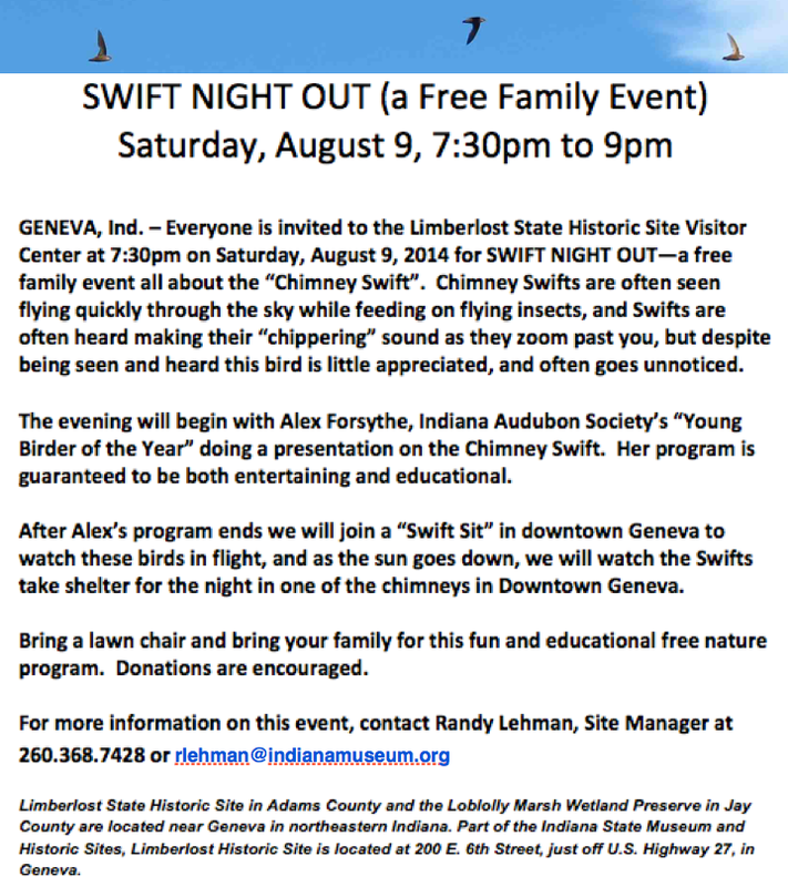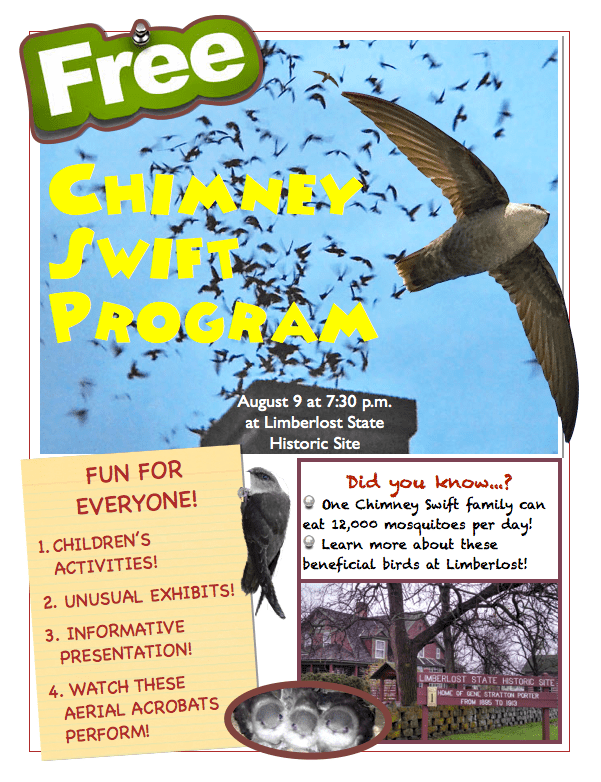 The Chimney Swift program on August 9 for a Swift Night Out was a huge success! An informative program about Chimney Swifts was held at Limberlost State Historic Site at 7:30 p.m. We had hands-on activities for the children, fantastic door prizes and more!