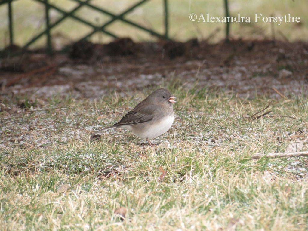 “A very quiet and well-conducted little member of our winter choir, with habits similar to those of the nuthatch, is the junco, with dark head and back, white breast, and grey sides. With an ivory-white bill, he feasts daintily at our winter offerings, occasionally remarking: ‘tsip, tsip’. This is merely a whisper of sound. Occasionally he pauses and whispers a high, halting strain of a few notes with small variation that I am unable to give any form of syllabication.” – Gene Stratton-Porter, “Homing with the Birds”.