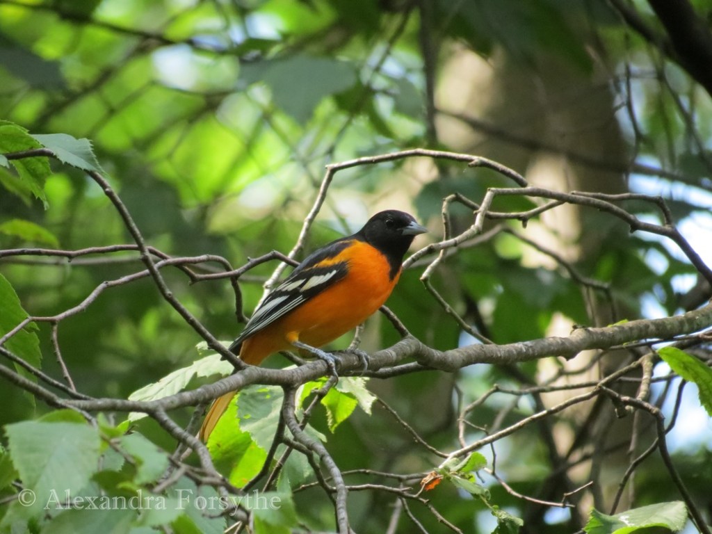 Not surprisingly, everyone wants to attract Baltimore Orioles to their yards. The best way to attract Orioles is through their stomachs. I set out fresh orange slices, but I also use grape jelly. I have found that it is best to use the least expensive jelly you can find and be consistent. If you switch to an expensive jelly, the birds don’t like to go back to the cheap stuff! It also helps to plant native fruit trees in your yard, preferably plants that bear dark-colored fruit at different seasons. I have several mulberry, raspberry, blackberry, chokecherry, and other native fruit-producing plants in my yard, so the Orioles tend to ignore the feeders once the fruits begin to ripen. Still I provide fresh oranges, jelly and clean water just in case they need an easy snack.