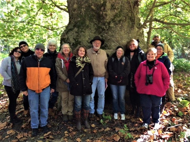 Photo of the poetry group in front of one of the Giant Sycamores of Rainbow Bottom.
