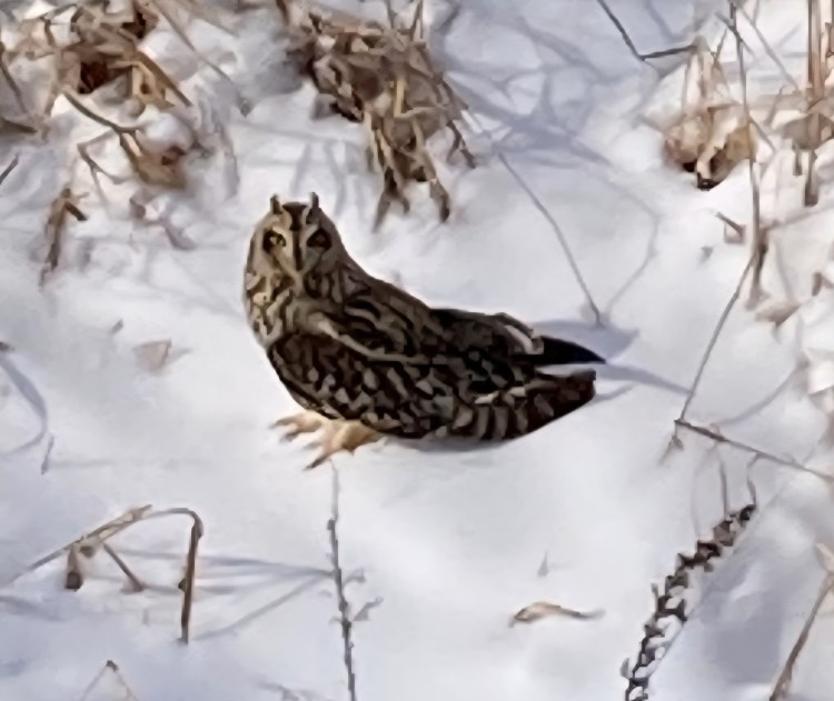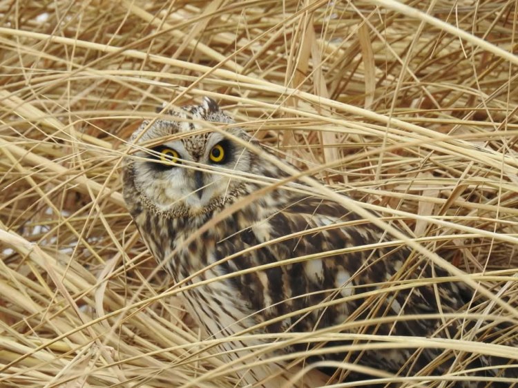 The short-eared owl is a widespread grassland species in the family Strigidae. Owls belonging to genus Asio are known as the eared owls, as they have tufts of feathers resembling mammalian ears. These “ear” tufts may or may not be visible. The short-eared owl will display its tufts when in a defensive pose, although it’s very short tufts are usually not visible.