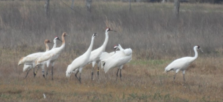 The Whooping Crane is 5’ tall with a 7’ wingspan. It is the tallest bird in North America. It is all white with a red cap on its head and black tips on its wings. The Whooping Crane is known for its bugling call and its graceful courtship dance, which consists of leaping, kicking, head-pumping and wing-sweeping. Quite a sight to see.